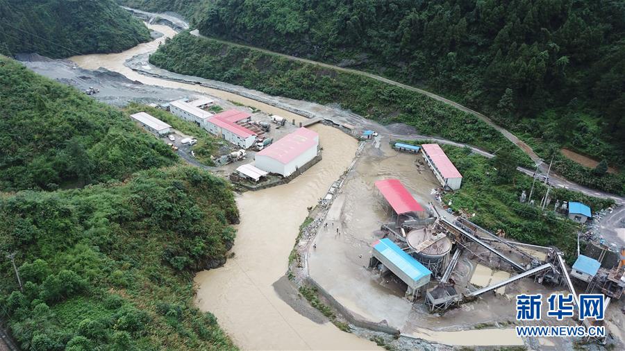 这是7月11日在永顺县永茂镇拍摄的吴明木所在的建筑工地,淤泥沉积,堤岸被洪水损毁(无人机照片)。 新华社发(陈振海 摄)