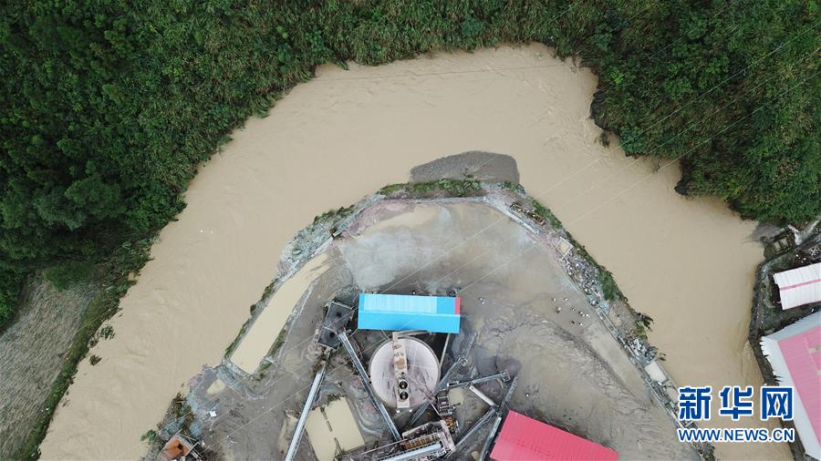 这是7月11日在永顺县永茂镇拍摄的吴明木所在的建筑工地,淤泥沉积,堤岸被洪水损毁(无人机照片)。新华社发(陈振海 摄)