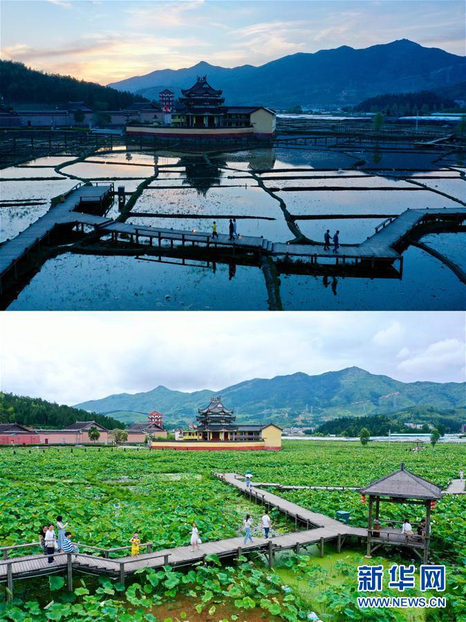 拼版照片:人们在浦源村鲤鱼溪公园内游览(上图为4月17日拍摄;下图为7月3日拍摄)。 新华社记者 姜克红 摄