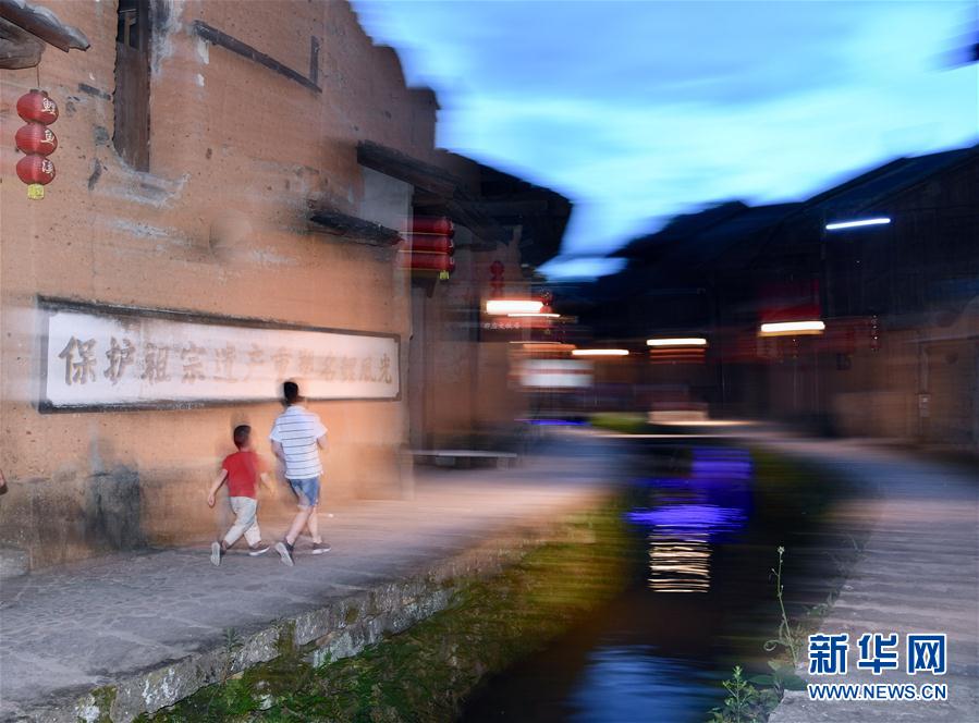 7月3日,两名小朋友从浦源村鲤鱼溪畔走过。 新华社记者 姜克红 摄