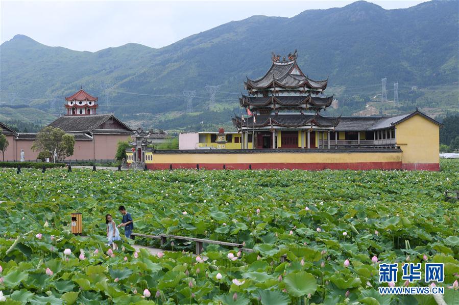 7月3日,浦源村鲤鱼溪公园内荷花盛开,吸引游人前来观赏(无人机照片)。 新华社记者 姜克红 摄