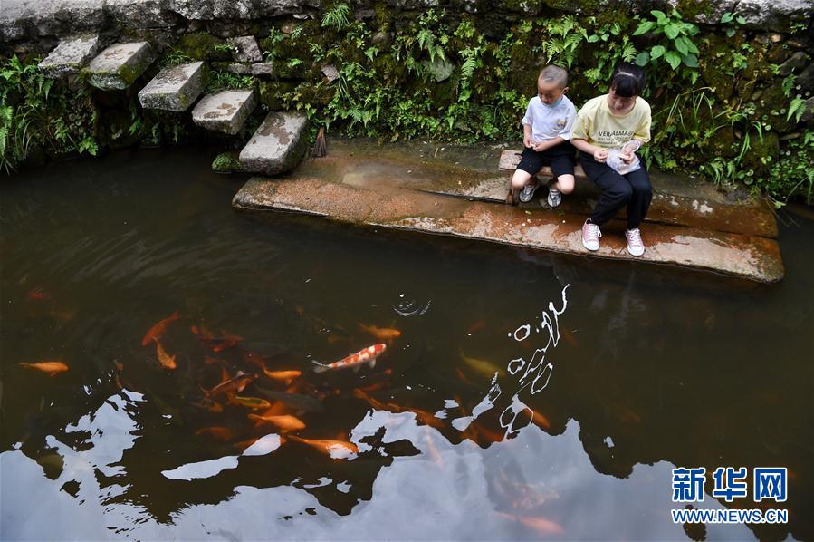 7月3日,小朋友在浦源村鲤鱼溪畔喂食溪中的鲤鱼。 新华社记者 姜克红 摄