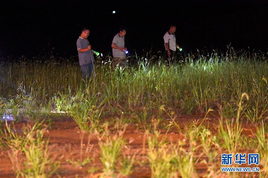 位于岳阳市君山区的洞庭湖大堤上,工作人员和群众在夜晚巡堤查险(7月11日摄)。 新华社记者 陈泽国 摄