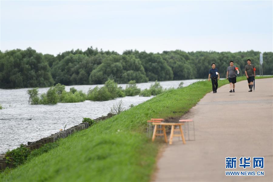 7月12日,工作人员在位于岳阳市君山区的洞庭湖大堤上巡堤。 新华社记者 陈泽国 摄