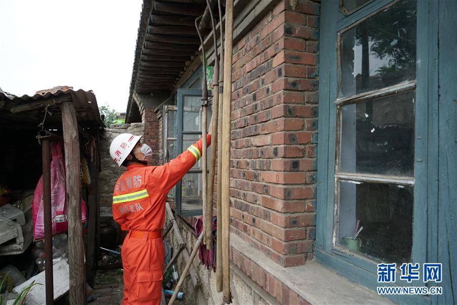7月12日,消防救援人员在河北省唐山市古冶区卑家店镇前巍峰山村村民家中排查。 新华社记者 牟宇 摄