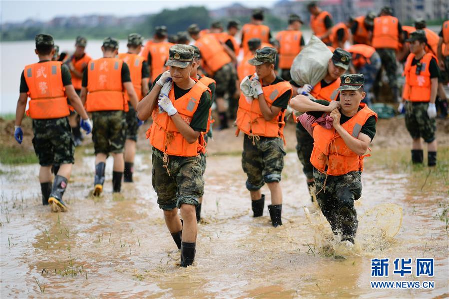 7月12日,武警江西总队机动支队官兵在鄱阳县昌江圩运送沙袋。新华社发(曹先训 摄)