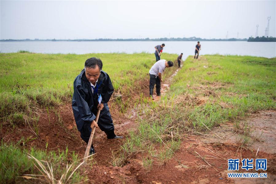 7月10日,在沅江市琼湖街道,抗洪志愿者黄新田(左一)开挖沟渠。 新华社记者 陈思汗 摄