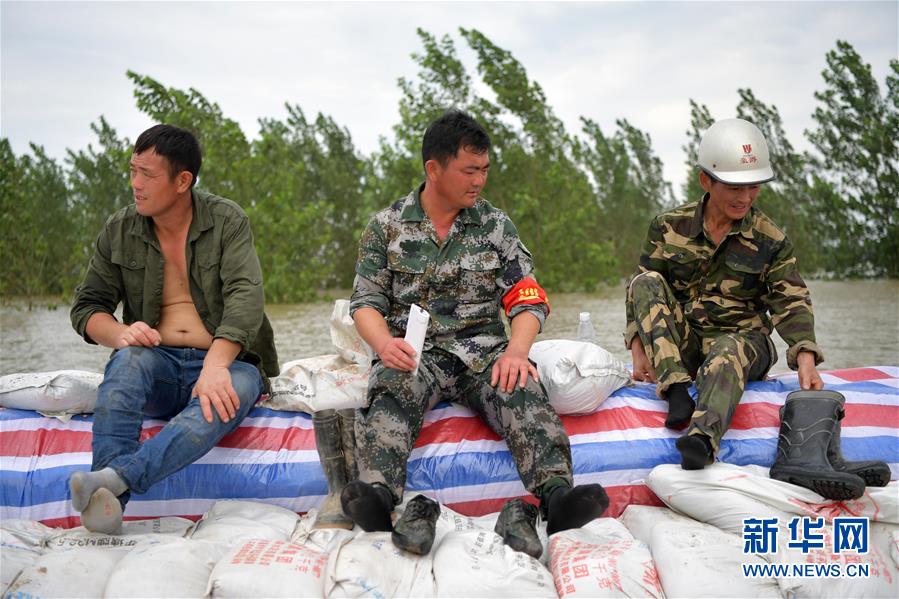 7月12日,在江西省九江市柴桑区江新洲的长江大堤上,江洲镇柳州村的村支书洪棉雪(中)和值守的村民在休息,由于长时间在水中劳动,他们一有空就会把鞋脱了,晾晒一下双脚。新华社记者 彭昭之 摄