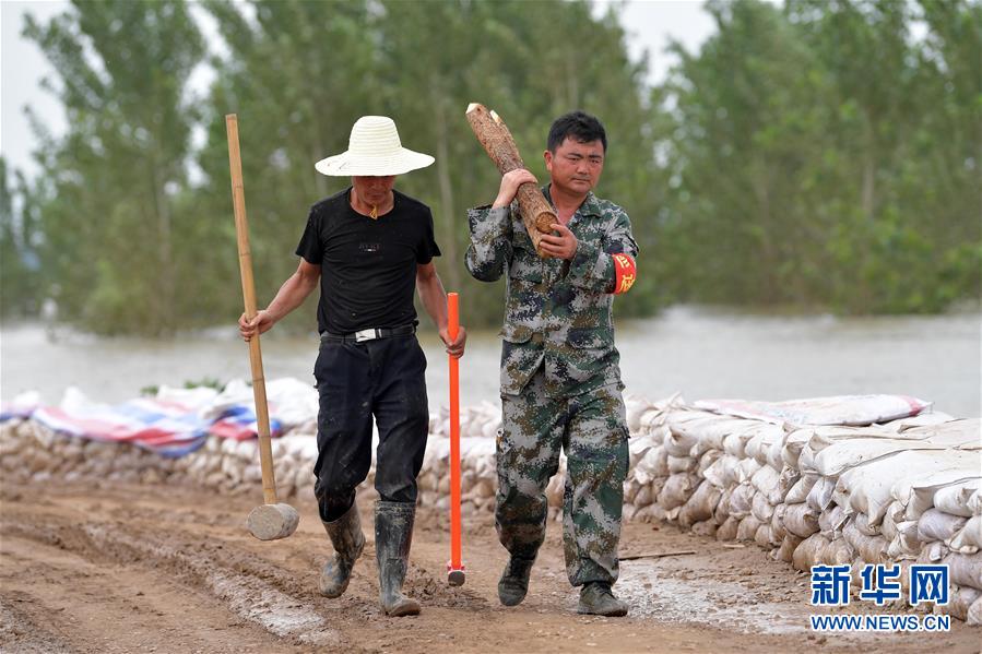 7月12日,江洲镇柳州村的村支书洪棉雪(右)扛着木桩和村民一起去打桩,加固堤坝。新华社记者 彭昭之 摄