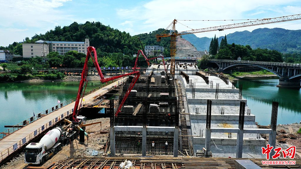 2020年7月13日,浙江台州,仙居县河埠大桥建设现场,施工人员冒着高温正在浇筑混凝土作业。王华斌/视觉中国