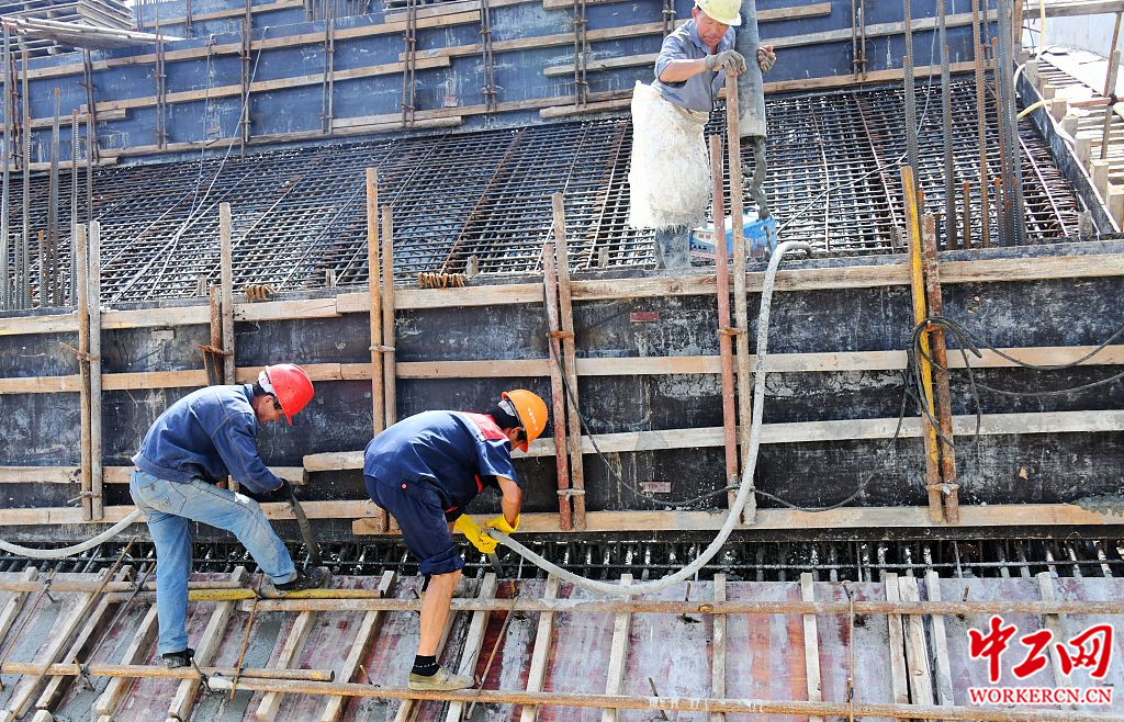 2020年7月13日,浙江台州,仙居县河埠大桥建设现场,施工人员冒着高温正在浇筑混凝土作业。王华斌/视觉中国