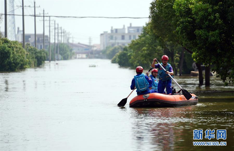 7月13日,在永修县三角乡,救援人员乘坐橡皮艇前往救援。 7月12日晚,江西省九江市永修县三角联圩出现溃堤险情,当地政府紧急组织群众转移,并设立安置点安置转移群众。截至13日下午,暂无人员伤亡报告。 新华社记者 周密 摄