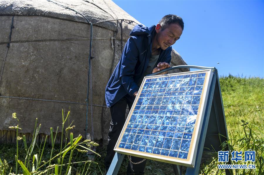 在新疆伊犁特克斯县境内的夏牧场里,一位牧民在毡房外调整太阳能板的摆放位置(7月2日摄)。 新华社记者 王菲 摄