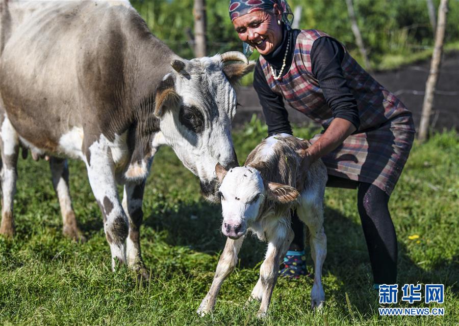 在新疆伊犁特克斯县境内的夏牧场里,一位牧民帮助刚刚出生的牛犊站起来(7月2日摄)。 新华社记者 王菲 摄