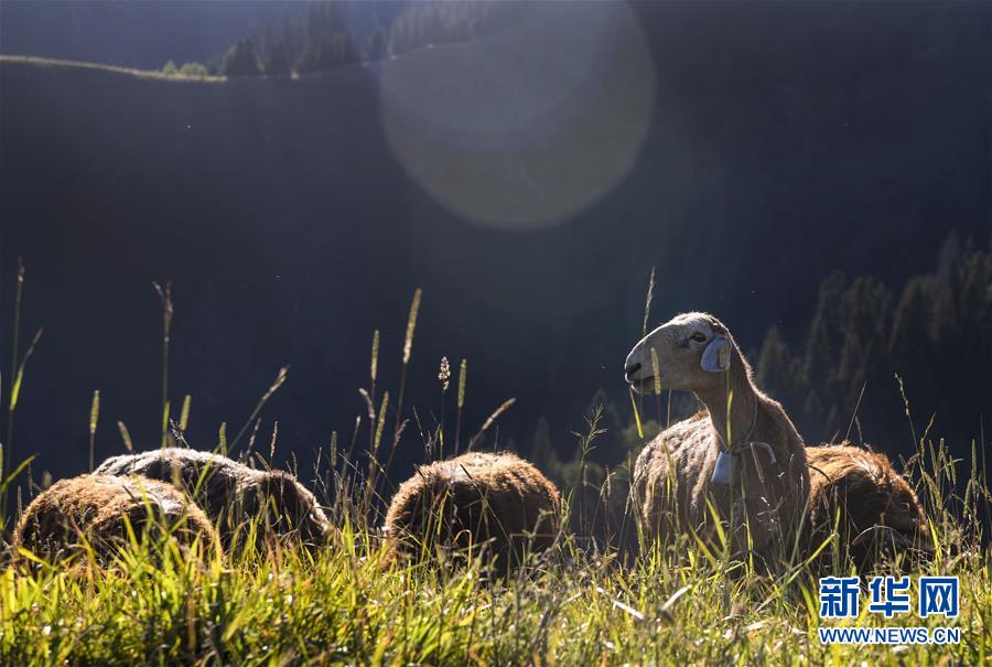 在新疆伊犁特克斯县境内的夏牧场里,羊群在吃草(7月2日摄)。 新华社记者 王菲 摄