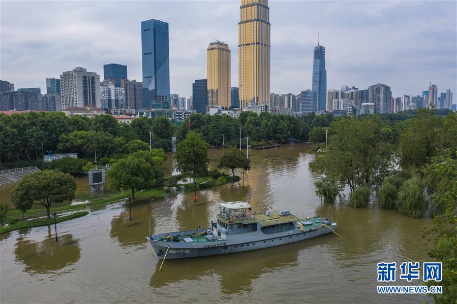 上涨的江水已淹到汉口江滩一级亲水平台(7月13日摄,无人机照片)。 当日17时,长江干流汉口站水位达28.74米,较之前的洪峰水位28.77米出现轻微下降。长江中下游洪水洪峰顺利通过汉口江段。 新华社记者 肖艺九 摄