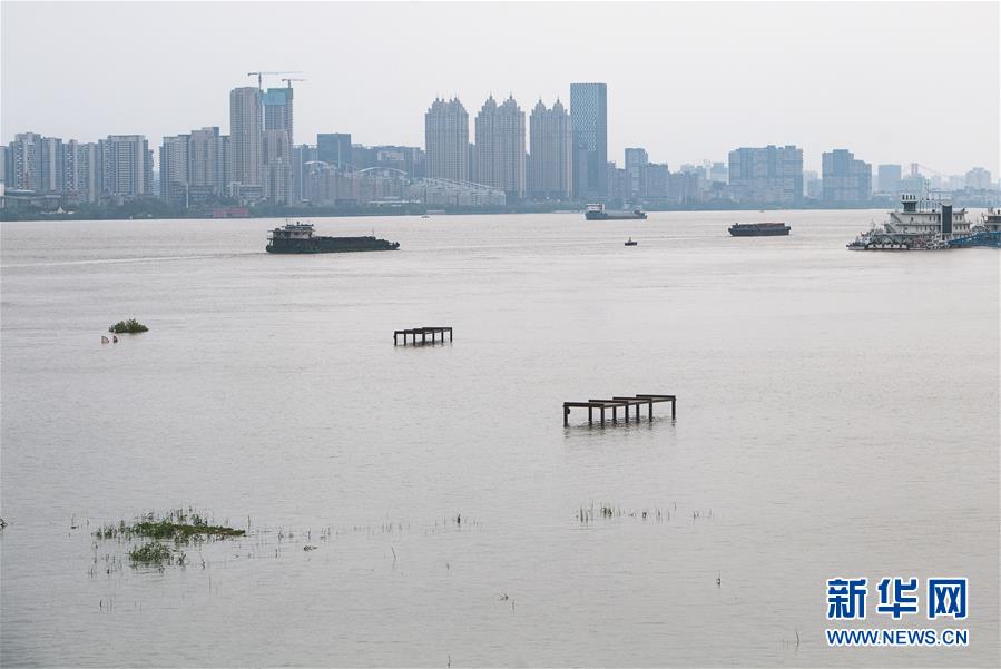 7月13日,船舶行驶在汉口江滩附近水域。 当日17时,长江干流汉口站水位达28.74米,较之前的洪峰水位28.77米出现轻微下降。长江中下游洪水洪峰顺利通过汉口江段。 新华社记者 肖艺九 摄