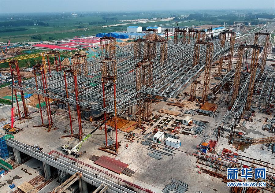 这是7月13日拍摄的郑州南站站房工程首片屋盖钢桁架吊装施工现场(无人机照片)。 当日,郑州南站站房工程首片1800吨屋盖钢桁架吊装提升到位。至此,郑州南站站房开启“封顶盖帽”第一步,完全封顶后,站房施工将转入金属屋面和外幕墙施工阶段。郑州高铁南站是郑州市第三个大型综合客运枢纽站,与郑州站、郑州东站形成“金三角”的枢纽格局。 新华社记者 李安 摄