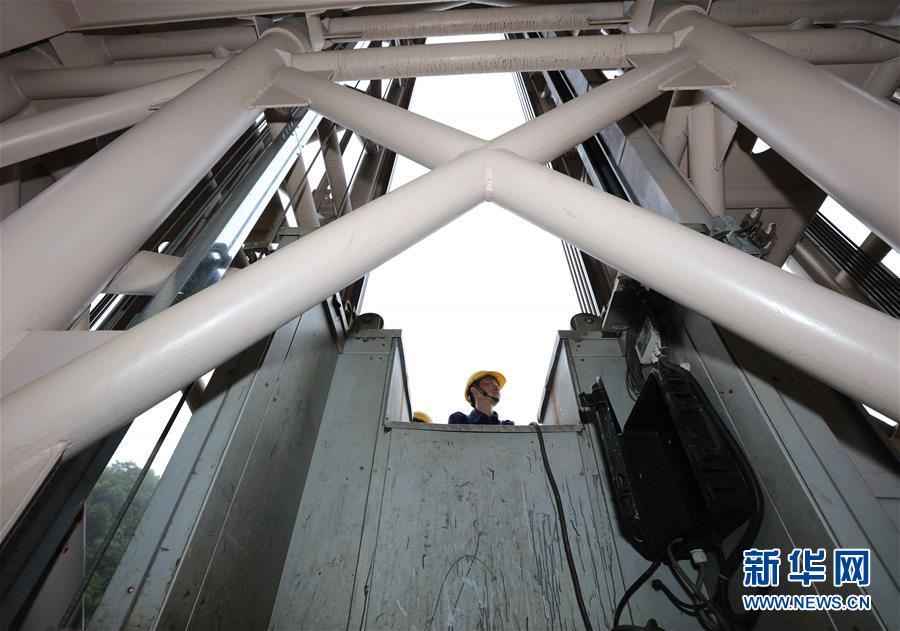 7月13日,湖南张家界市武陵源区百龙天梯工作人员在悬崖钢井架上巡检。 针对今年夏季降雨量大、持续时间长的情况,张家界市武陵源区组织各景区旅游企业在完善应急保障机制的基础上,加大对载人旅游设施的检查力度,确保汛期游览安全。 新华社发(吴勇兵 摄)