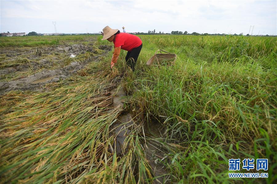 7月11日,村民在湖南省岳阳市岳阳县筻口镇一处农田里收割倒伏的早稻。 新华社记者 陈泽国 摄