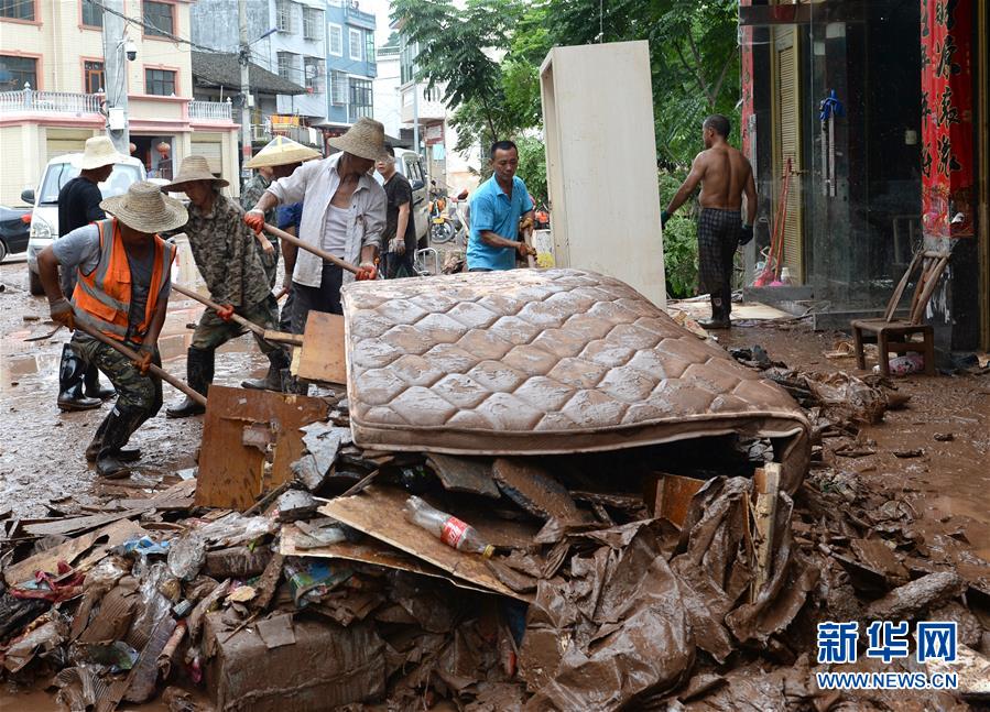 7月9日,在湖南湘西土家族苗族自治州泸溪县白羊溪乡,村民清理受损物品。 新华社发(陈振海摄)