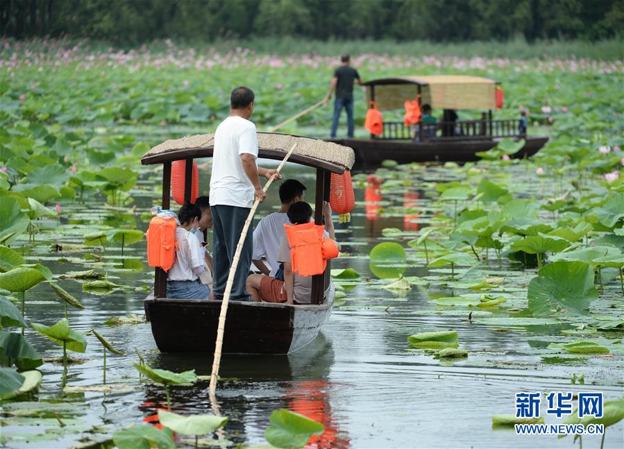 7月13日,游客乘船在莲花湖湿地公园内观赏荷花。 近日,辽宁省铁岭市莲花湖湿地公园内成片的荷花竞相开放,游客乘船行进其中,美不胜收。 新华社记者 杨青 摄