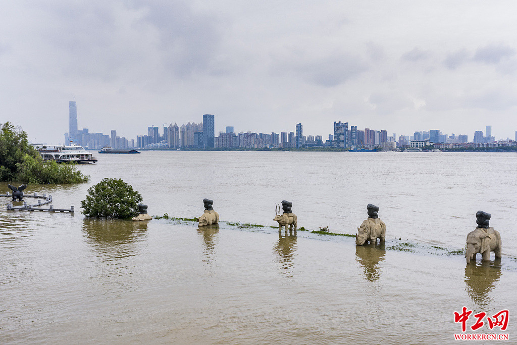 2020年7月13日,武汉,汉阳江滩大禹神话园,大部分亲水平台已没入水中,神话雕像宛若立在水中。乔治/人民视觉