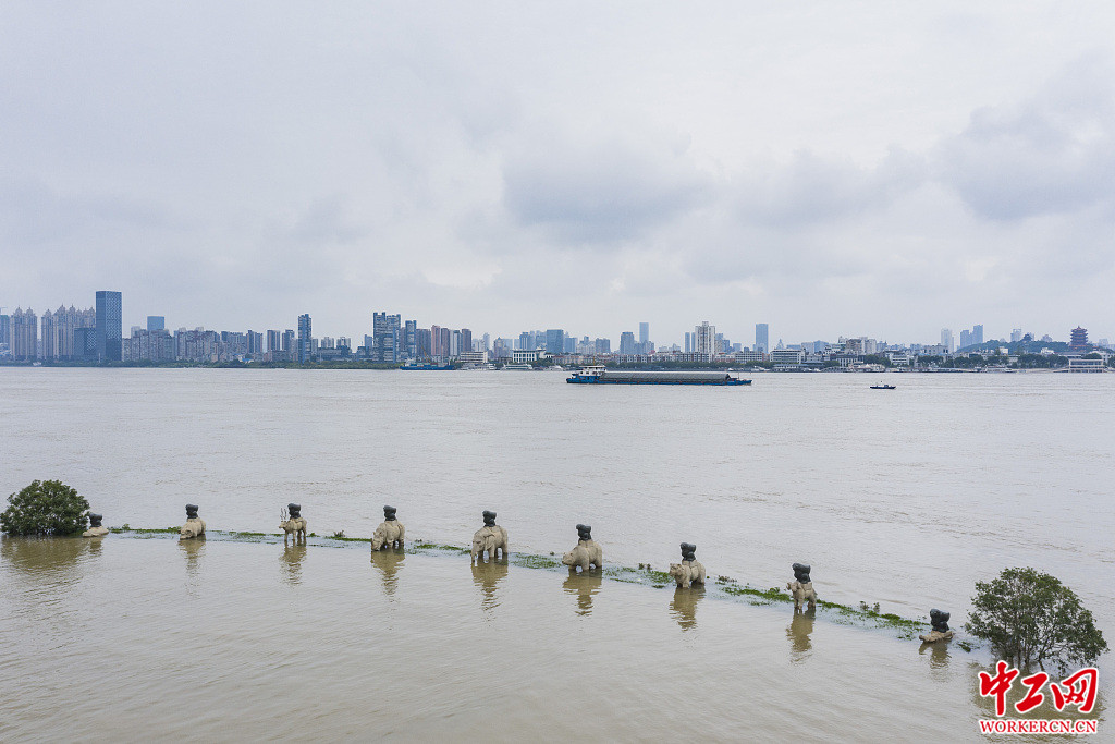 2020年7月13日,武汉,汉阳江滩大禹神话园,大部分亲水平台已没入水中,神话雕像宛若立在水中。乔治/人民视觉
