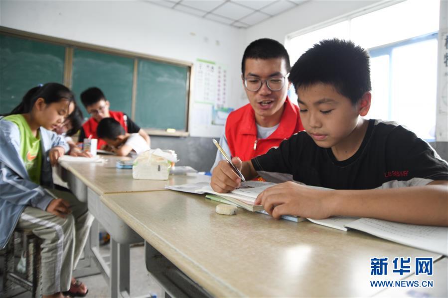 7月14日,在安徽省芜湖市鸠江区沈巷镇大蒋村沿路小学安置点,志愿者在辅导小朋友写暑假作业。 安徽省芜湖市鸠江区沈巷镇陈兴祝和黄罗两个自然村紧邻长江且地势较低。随着长江水位的进一步上涨,为保障村民生命安全,7月11日,当地转移70名村民至附近小学临时安置。 新华社记者 张端 摄