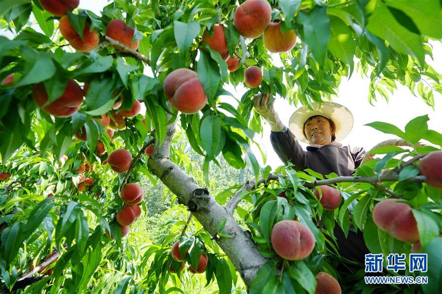 7月14日,河北省迁安市亚滦湾农业公园的工人在采摘鲜桃。新华社记者 牟宇 摄