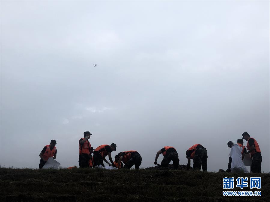 7月13日,在安徽省望江县雷池乡同马大堤上,武警官兵在填装防洪袋,对大堤进行加固。新华社记者 李亚彪 摄