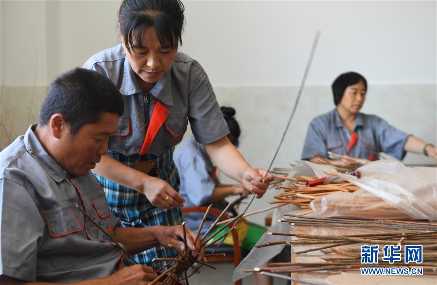 7月14日,在善满家园残障人综合服务中心,培训师王秀萍(左二)指导残疾人学习柳编。新华社记者 林宏 摄