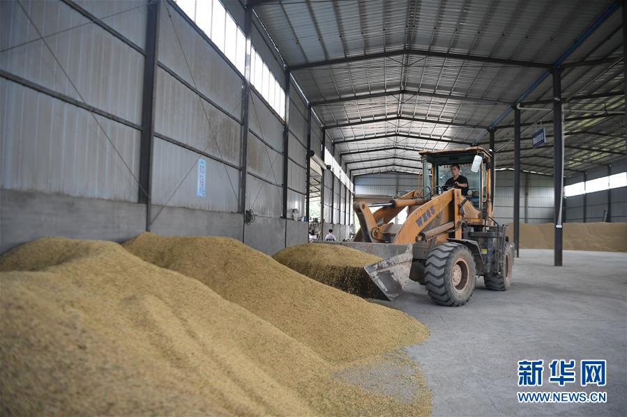 7月14日,益阳市赫山区欧江岔镇红胜水稻种植专业合作社工作人员驾驶铲车装运准备烘干的稻谷。 当日,湖南省益阳市赫山区的农民趁着难得的晴天,抓紧抢收、烘晒稻谷。 新华社记者 薛宇舸 摄