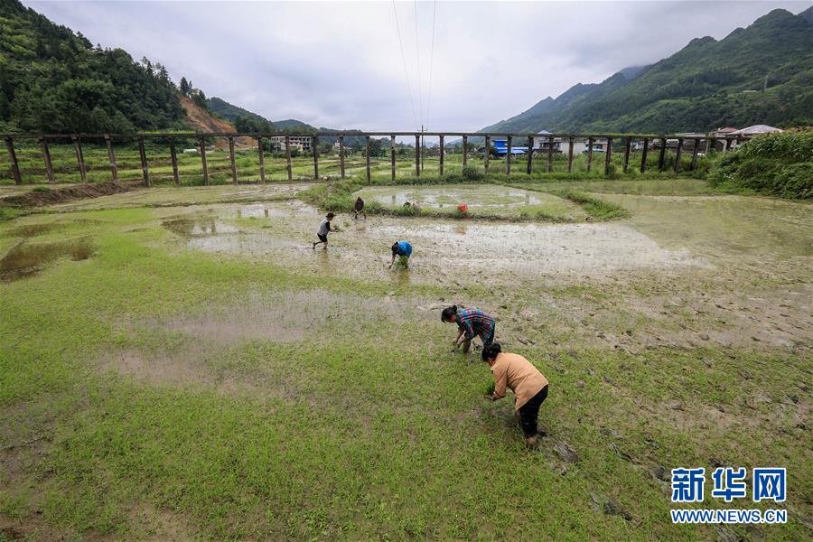 7月14日,在湖南省湘西土家族苗族自治州龙山县苗儿滩镇六合村,农民在田间抢插水稻。 6月下旬以来,湖南省部分地区持续出现强降水,农作物不同程度受灾,当地农民积极进行生产自救,抢插水稻,降低灾害损失。 新华社发(曾祥辉 摄)