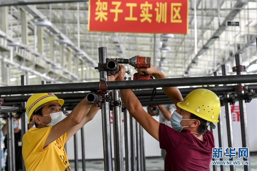 7月14日,新疆喀什地区巴楚县农民肉孜·买买提(左)和木合塔尔·如苏力在练习安装脚手架。 新疆喀什地区巴楚县面向农牧民开展多种就业技能培训,拓宽就业渠道,促进就业增收。据巴楚县人力资源和社会保障局介绍,结合各行业用工需求和农牧民意愿,该县已开设大型工程机械、砌筑工、木工、电工等14种技能培训。 新华社记者 马锴 摄