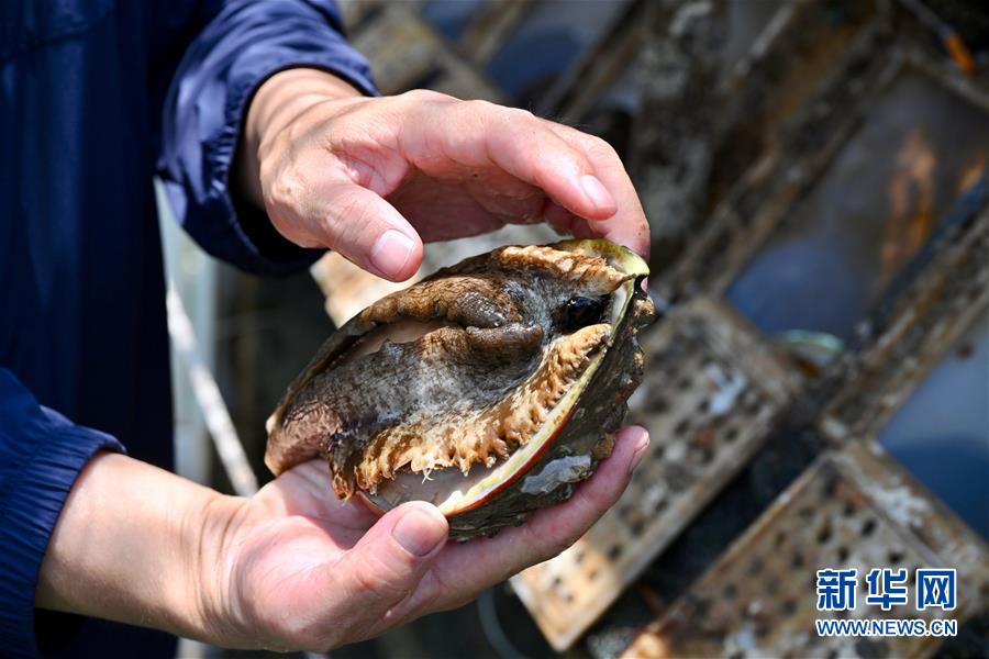 7月14日,在福建省连江县深远海养殖平台“福鲍一号”上,工作人员展示长势良好的鲍鱼。新华社记者 姜克红 摄