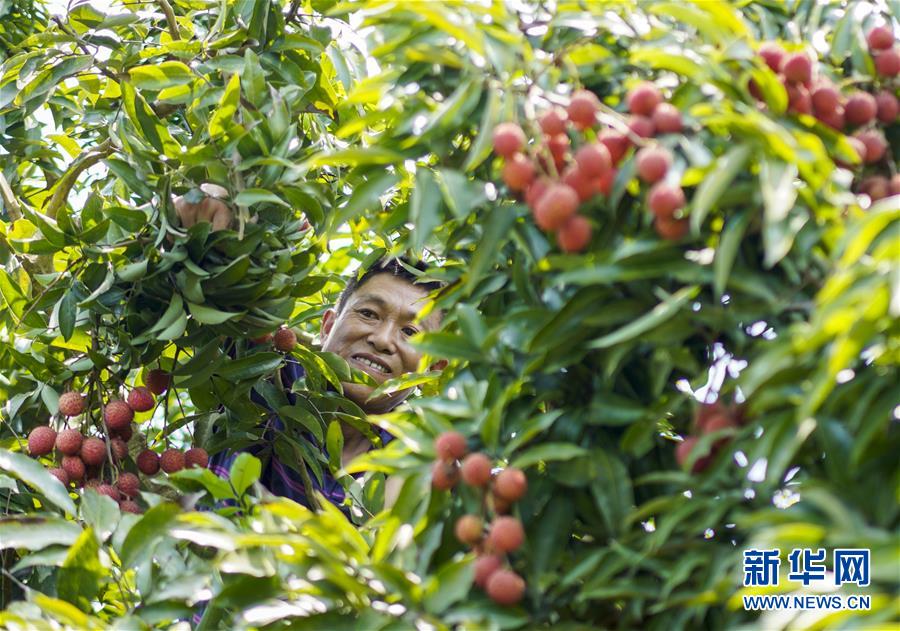 7月14日,在睦和村的荔枝果园内,村民黄明在荔枝树上采摘荔枝鲜果。 新华社记者 刘潺 摄