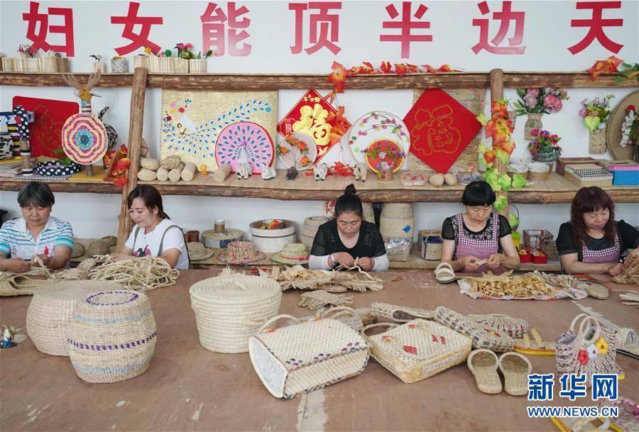 7月15日,秦皇岛市抚宁区抚宁镇的妇女在孤竹园草编基地编制草编工艺品。 新华社记者 杨世尧 摄