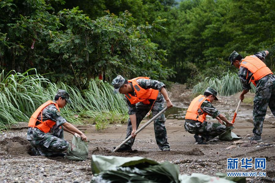 7月14日,在湖南省湘西土家族苗族自治州龙山县苗儿滩镇,当地民兵在防洪演练中装填沙袋。新华社发(陈振海 摄)