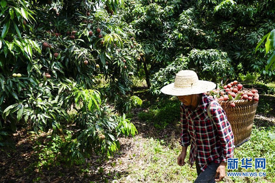 7月14日,在睦和村的荔枝果园内,睦和村村民侯艮秀背着满背篓的荔枝准备进行销售。新华社记者 刘潺 摄