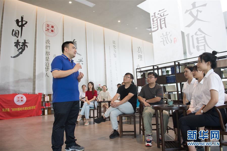 7月15日,生于1994年的中浙高铁轴承有限公司员工张佩思为龙游县年轻机关干部讲述自己钻研高铁轴承技术的努力。新华社记者翁忻旸摄