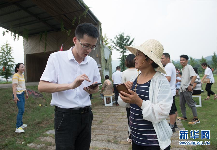 7月14日,在横山镇天池村,生于1983年的范磊在一次宣讲后被一位村民拉住,要加他微信咨询问题。新华社记者翁忻旸摄