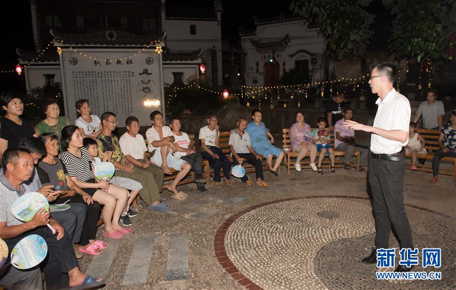 7月14日,在塔石镇泽随村,村民在聆听生于1983年的范磊关于发展乡村旅游的宣讲。新华社记者翁忻旸摄