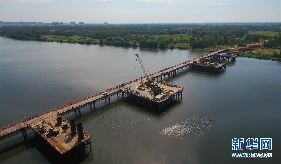 7月15日航拍的文临公路南渡江特大桥项目施工现场。 近日,在海南省国道G360文昌至临高公路南渡江特大桥项目施工现场,工人们抓紧时间进行桥桩的施工作业。文临公路路线全长121.88公里,采用双向四车道的干线一级公路设计标准。据了解,文临公路是国家发改委、交通运输部、国务院扶贫办确定的“十三五”交通扶贫“双百”工程项目之一,同时也是海南省“十三五”重大交通基础设施项目。 新华社记者 杨冠宇 摄
