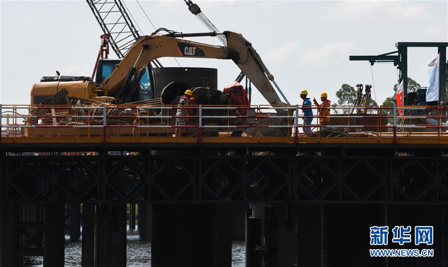 7月15日,工人在文临公路南渡江特大桥项目施工现场施工。 近日,在海南省国道G360文昌至临高公路南渡江特大桥项目施工现场,工人们抓紧时间进行桥桩的施工作业。文临公路路线全长121.88公里,采用双向四车道的干线一级公路设计标准。据了解,文临公路是国家发改委、交通运输部、国务院扶贫办确定的“十三五”交通扶贫“双百”工程项目之一,同时也是海南省“十三五”重大交通基础设施项目。 新华社记者 杨冠宇 摄