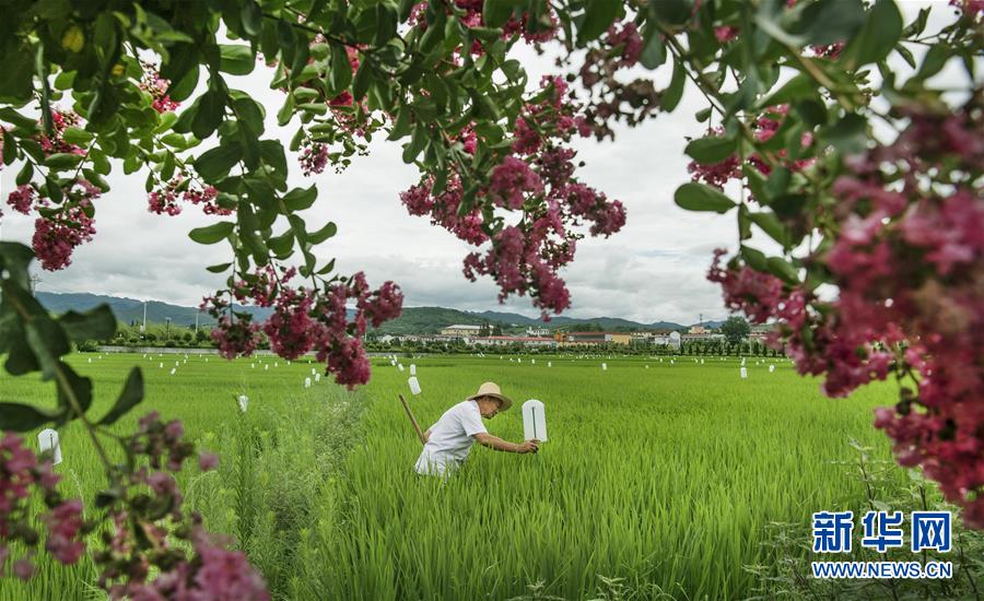 7月15日,洋县纸坊街道草坝村村民查看水稻田间的昆虫诱捕器。新华社记者 陶明 摄