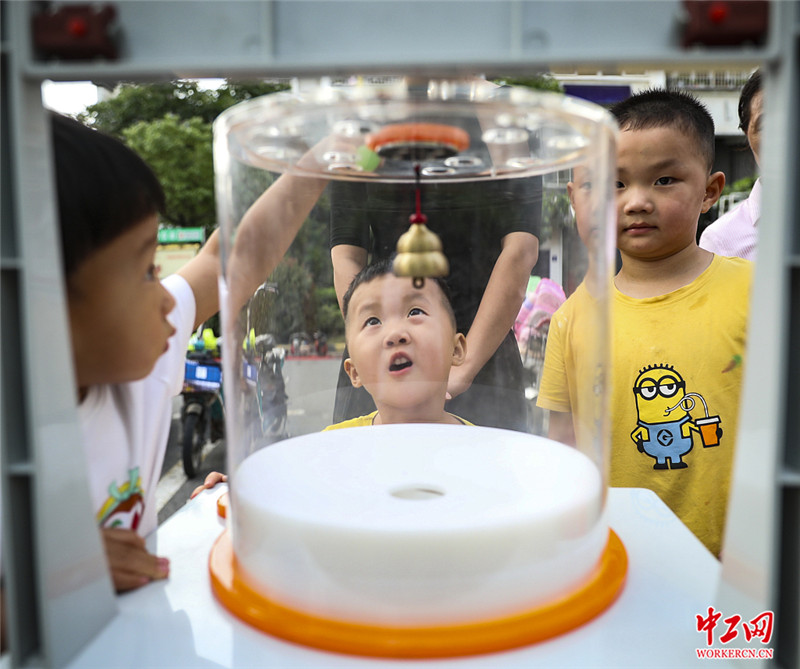 2020年7月15日,江苏淮安,小朋友在社区体验科学实验装置。赵启瑞/视觉中国