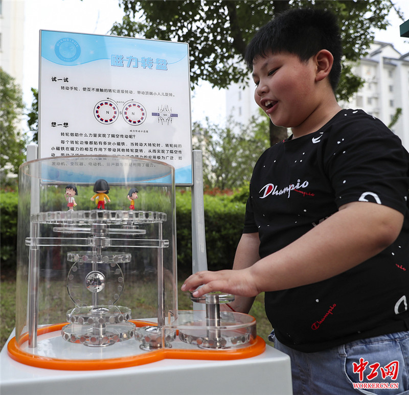2020年7月15日,江苏淮安,小朋友在社区体验科学实验装置。赵启瑞/视觉中国