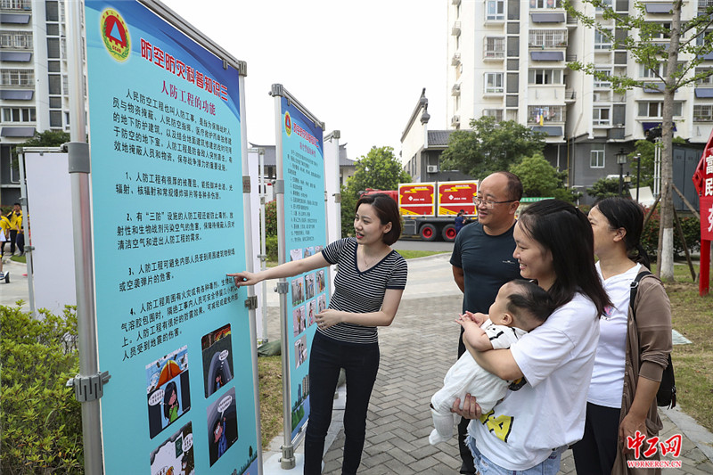 2020年7月15日,江苏淮安,人民防空工作人员向居民宣传防空知识。赵启瑞/视觉中国