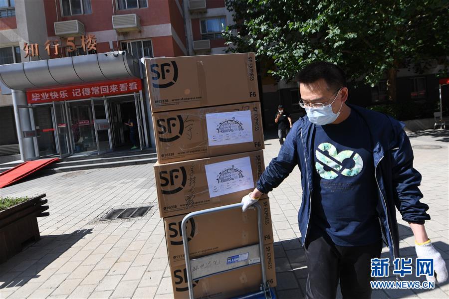 7月15日,在中国人民大学宿舍楼下,老师拉运打包好的毕业生行李。 新华社记者 鞠焕宗 摄